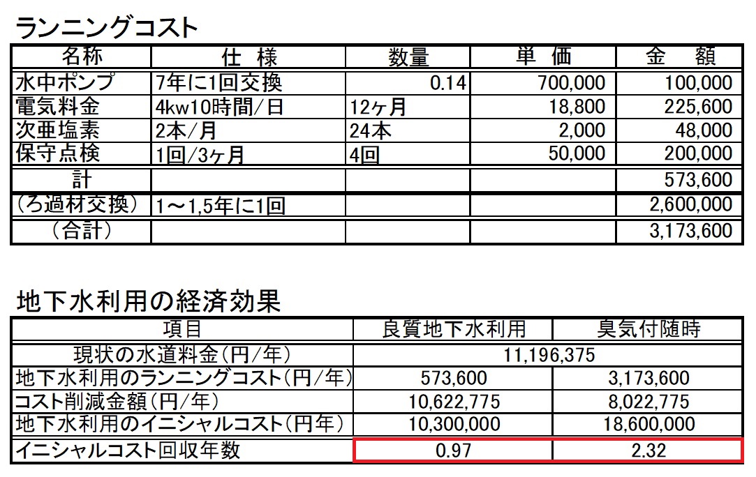 ※イニシャル・ランニングコストは上記の事例(良質地下水)で計算